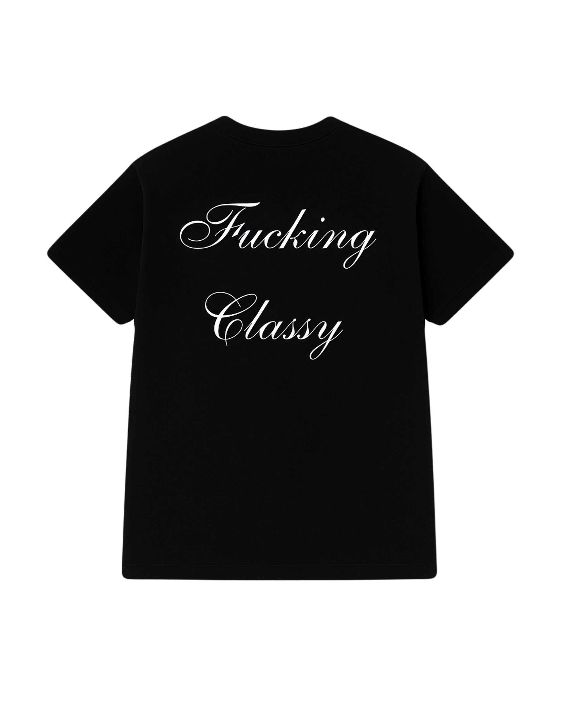 Černé tričko s malým logem vpředu a velkým nápisem „Fucking Classy“ vzadu.