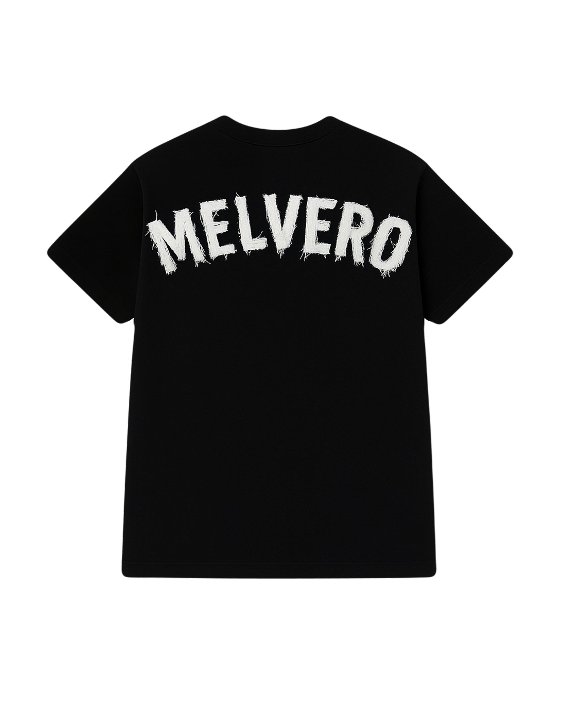 Písmena jsou vyrobená z bílé džínoviny s roztřepeným efektem.